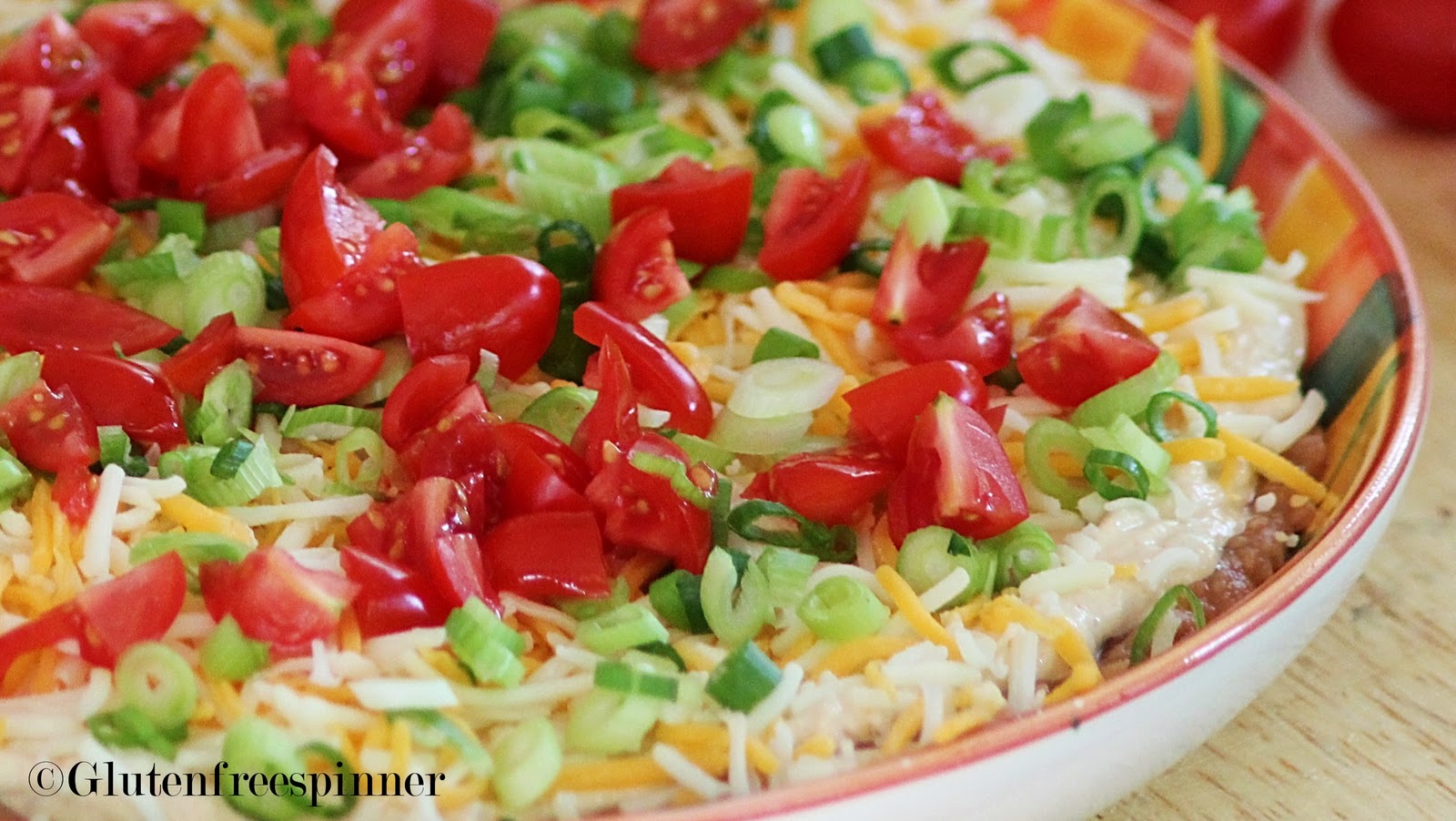 On a platter, arrange lettuce, leaving a 2 inch rim at the edge of the platter. Combine bean dip and picante sauce. Spread bean mixture over lettuce. Next, layer sour cream and avocado dip. Top with cheese, onions, and tomatoes. Cover and chill up to 24 hours
