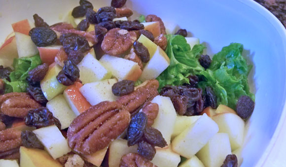 Place washed mixed greens in medium bowl; top with apples, raisins, and pecans. Toss well and top with desired dressing.
