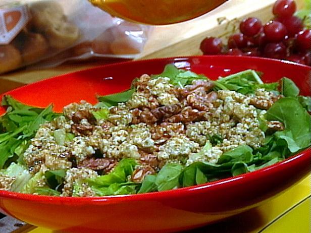 Add apples to arugula and then top with blue cheese and nuts.