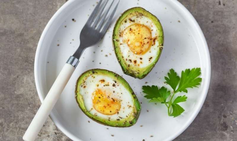 2. Arrange avocados in a single layer on a baking dish. Crack an egg into each half of the avocado and season with salt and pepper.