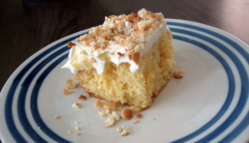 Once cake has completely cooled, spread on whipped topping. Spread crushed wafers on top of the cake. You can do this part immediately before serving the cake if you like.