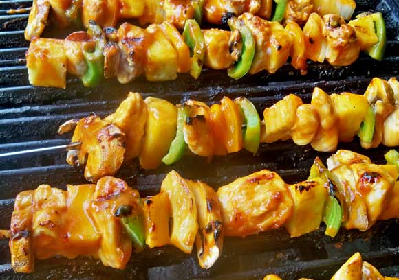 Prepare grill. Baste grill rack with cooking oil before placing over fire. Cube chicken into bite size pieces. Cube peppers and onion into bite-size pieces. Leave mushrooms whole. Spear chicken, vegetables and pineapple onto kabob skewers, alternating pieces to give a variety on each. Coat each kabob with sauce (from the recipe below) and cook over medium hot grill about 10-15 minutes or until vegetables are softened and chicken is done.
