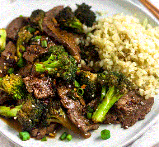 Ingredients • 1 pound of raw beef round steak, cut into strips. (You want 10 ounces cooked) • 1 tablespoon and 2 teaspoon low sodium soy sauce • 1 Splenda packet (optional) • ½ cup water • 1/1/2 cups broccoli florets (should yield 1 cup cooked) • 1 teaspoon sesame or olive oil • 2 cups cooked, grated cauliflower or frozen riced cauliflower
