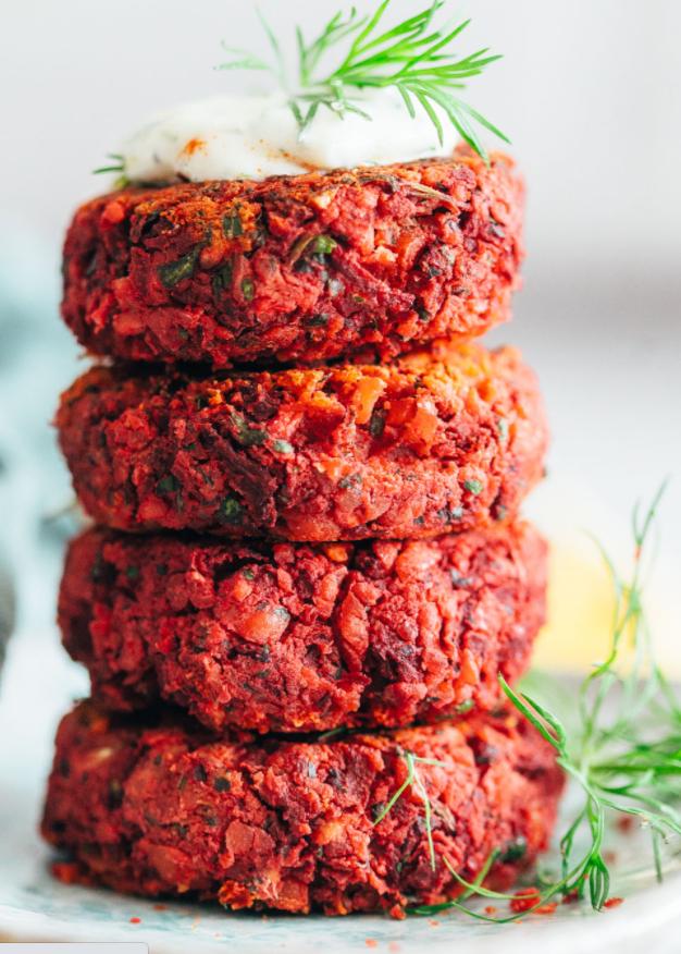 3. To food processor add garlic and parsley and pulse to chop into small bits. Then add baked chickpeas, shredded beets, cumin, salt, tahini, and lemon juice, and pulse for about 15-30 seconds. Be careful not to overmix — the mixture shouldn’t be puréed, just a tacky texture that forms easily when squeezed between your fingers. If too wet, you can dry it out with some oat flour (but we didn’t find it necessary). If too dry, add more tahini or lemon juice.