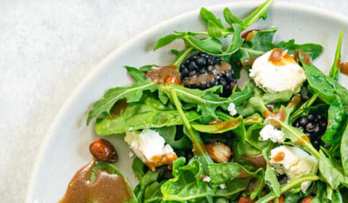 Greens, almonds, blackberries and feta or goat cheese, dressed with homemade balsamic vinaigrette.