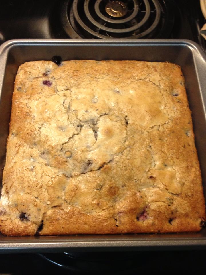 4. Grease a 9-inch square baking pan (or something similar) with butter or coat with non-stick spray. Spread batter into pan. Sprinkle batter with remaining tablespoon of sugar. Bake for 35 minutes. (Note: Baking for as long as 10 minutes more might be necessary.) Let cool at least 15 minutes before serving.