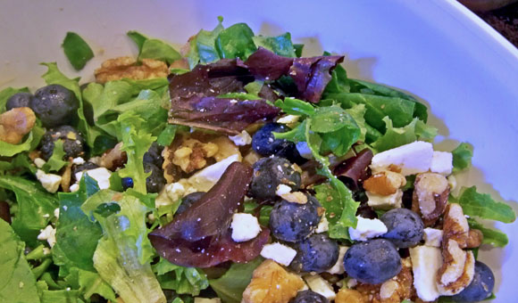 Toss together spinach and greens, blueberries, walnuts and blue cheese. Mix in dressing, or serve dressing on the side.