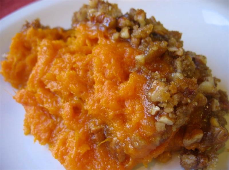 Sprinkle the surface of the sweet potato mixture evenly with the crust mixture and return to oven for 10-20 minutes or until crumble is browned.