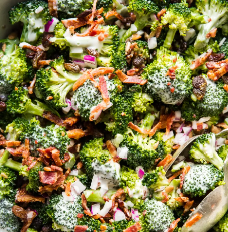 Mix first five ingredients. Pour dressing over broccoli and toss to coat. Stir in bacon crumbles just before serving.