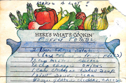 Frozen hash browns or potatoes baked with butter, onions, cheese and cream of chicken soup.
