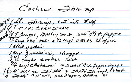 Saute onions, red pepper, garlic, and zucchini. Stir in shrimp, rice and cashews. Cook until heated through.