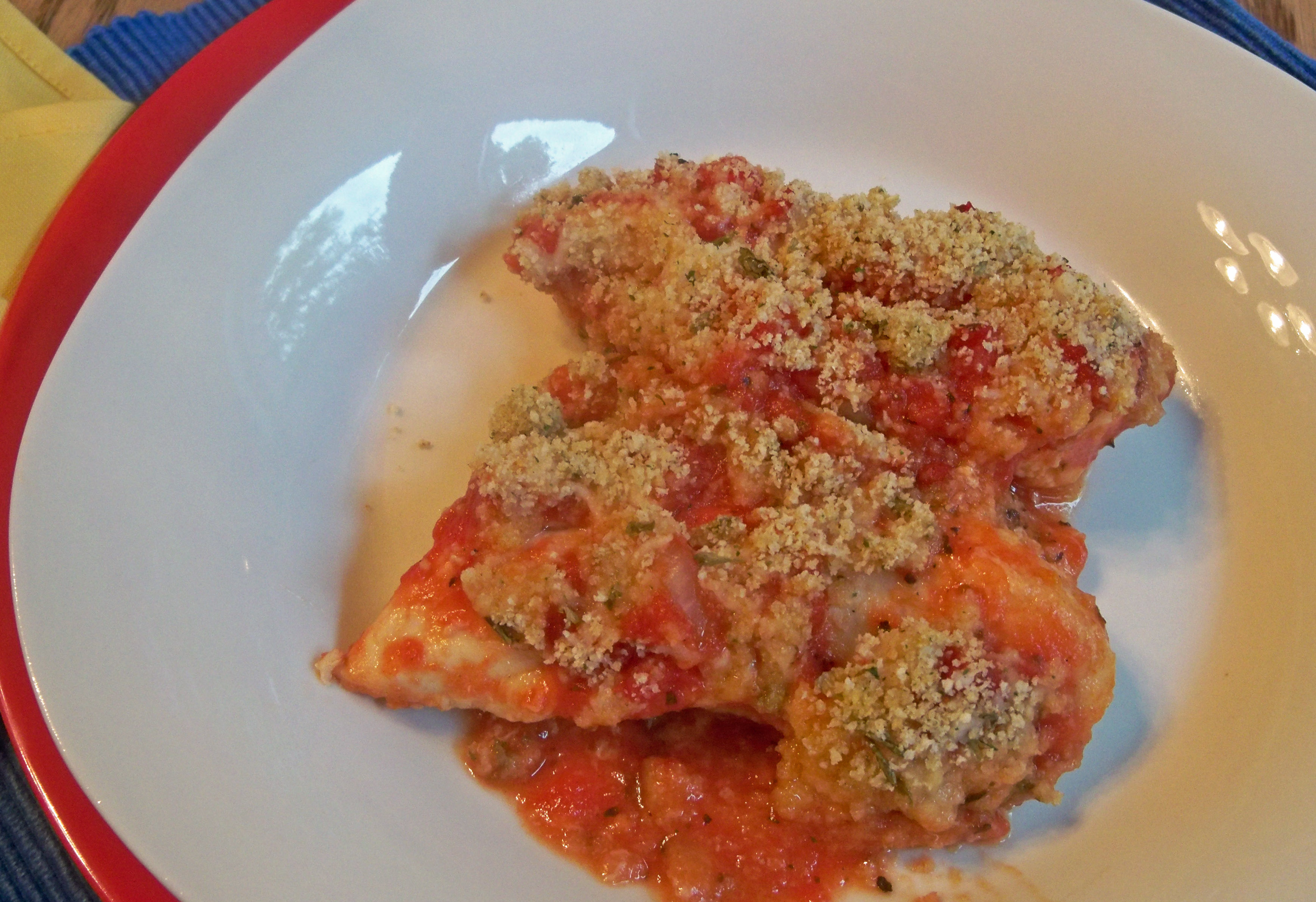 Chicken baked in tomato basil sauce topped with mozzarella and bread crumbs.