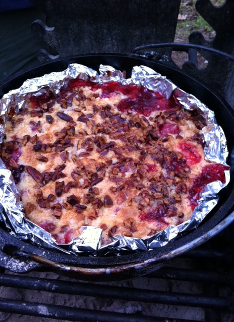Mix fruit together in 10 in dutch oven. Sprinkle cake mix over top of the fruit to completely cover. Cut butter into pats and place them evenly around the top of cake mix. Sprinkle pecans evenly over top. Bake at 350 degrees or until cake mix an nuts are brown.
