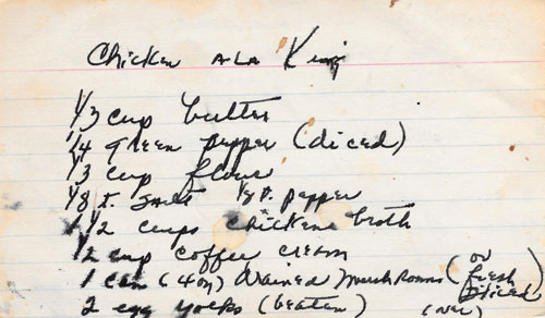 Add yolks. Reduce heat, and add remaining ingredients (chicken, peas, and pimiento).