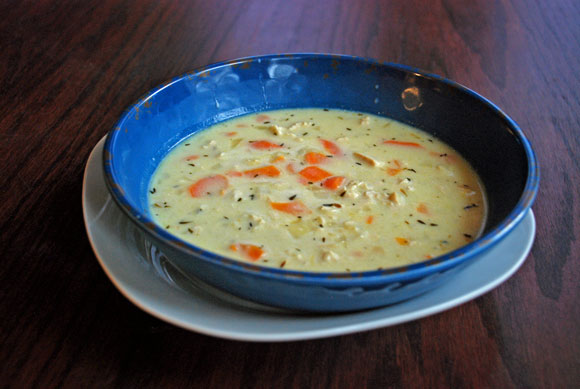 Creamy wild rice soup; perfect for using leftover chicken or turkey.
