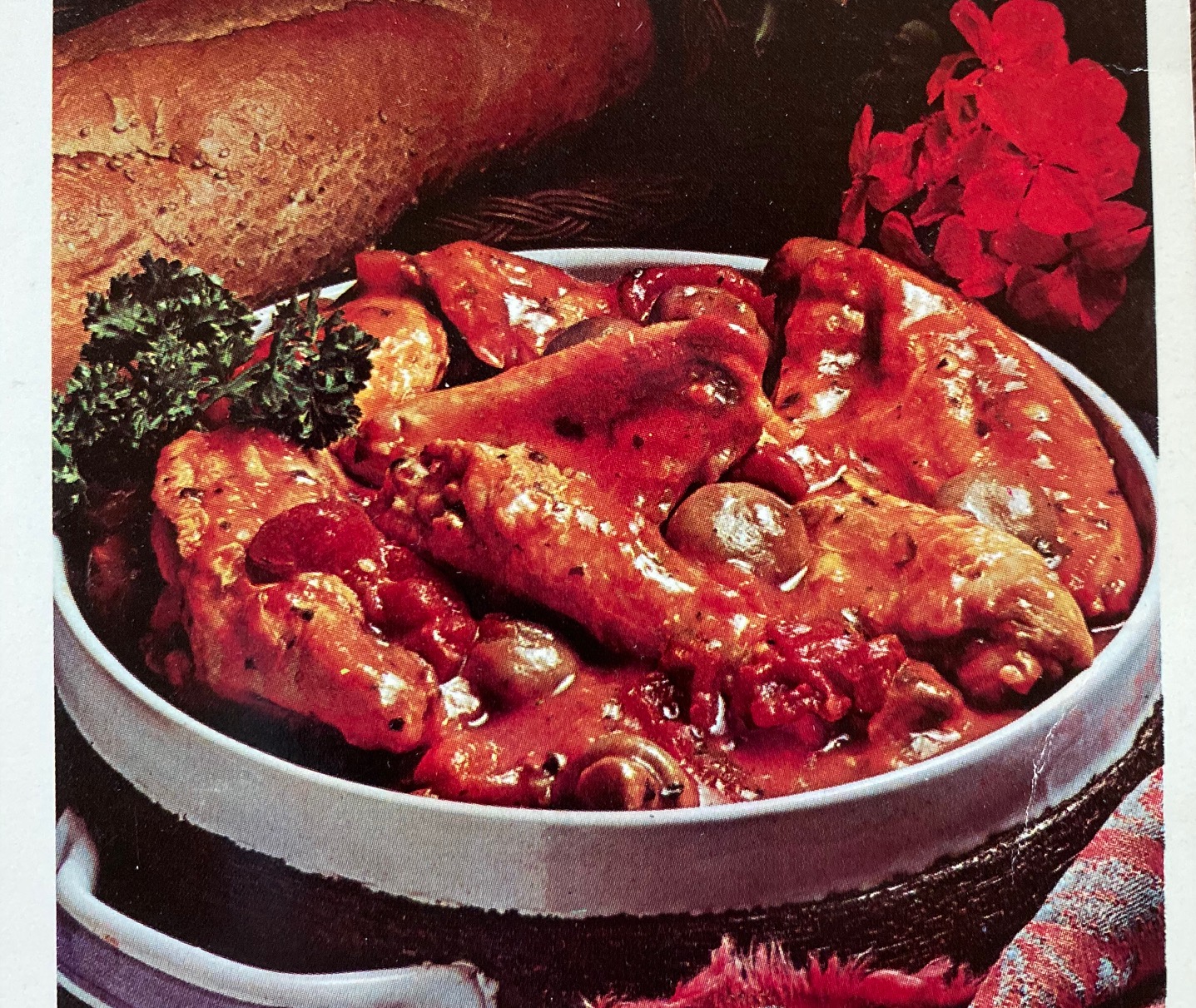Chicken in a red wine tomato sauce, cooked a day ahead, then reheated before serving.
