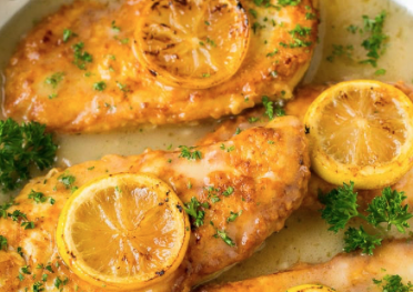 Heat oven to 400 degrees. Beat eggs. Spread flour in a shallow pan. Heat oil. Sprinkle chicken with salt. Dip chicken in flour and then in egg. Cook chicken 3 mins. each until golden. Put aside. In a saucepan, add chicken broth, wine, and lemon juice and bring to a boil. Boil 6 mins. until mixture is reduced. Remove from heat and whisk butter into sauce until slightly thickened. Stir in parsley and pepper. Pour over chicken and bake until heated through and chicken is all the way cooked.