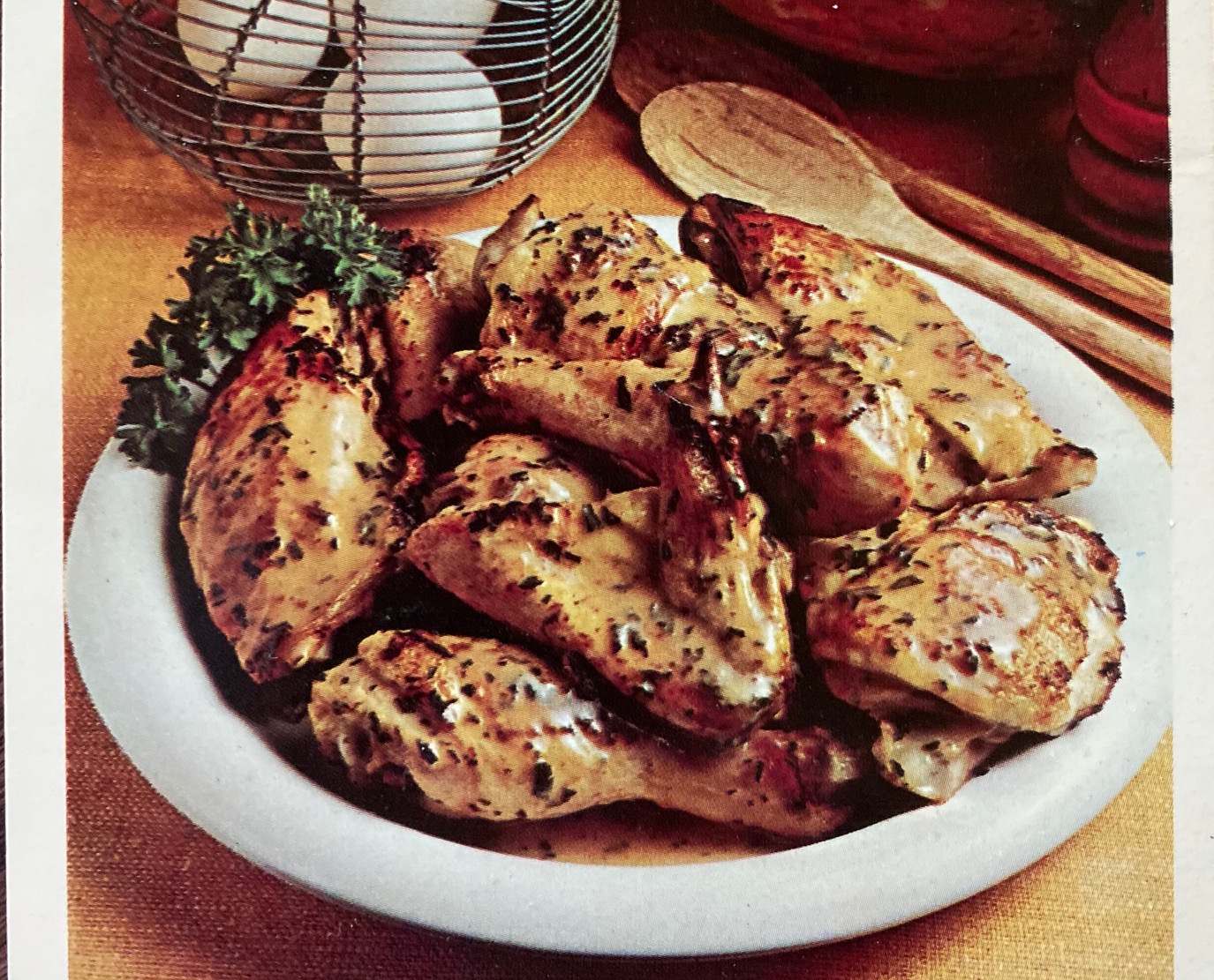 Marinated chicken braised and served in white wine sauce; can be made ahead the day before and reheated gently before serving.