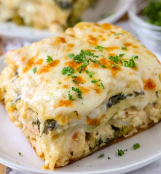 Lasagna made with chicken, mushrooms and cheese and a creamy white sauce.