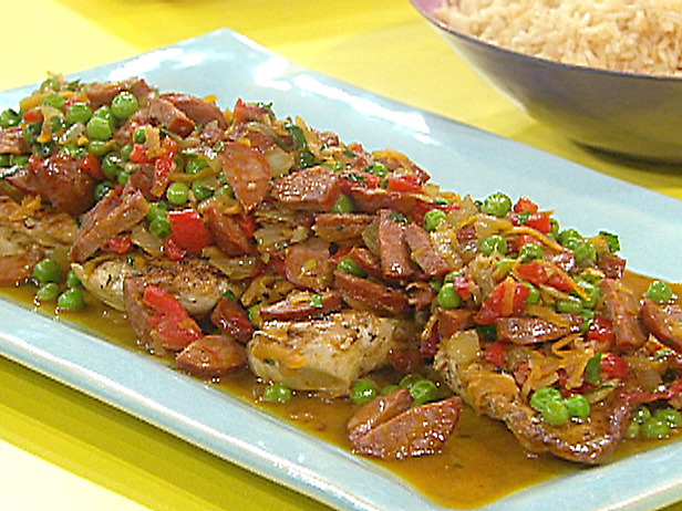Chicken with Roasted Red Pepper, Chorizo and Sweet Pea Sauce ove
