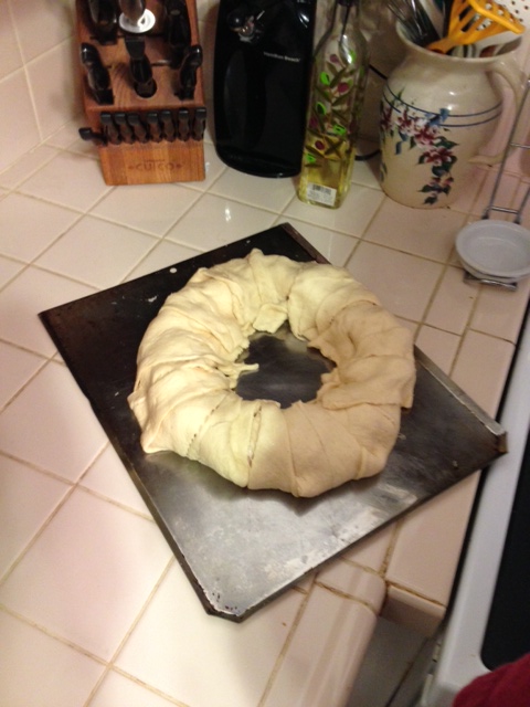 Preheat oven to 375 (or whatever the crescent roll can says). Mix well the cream cheese, chicken, sesame seeds, parsley and onion. Open the crescent rolls. Do not separate the triangles - keep every two together to make rectangles. Pinch seams closed and pat into larger squares. Place one two-triangle set down and spoon mixture onto the dough. Place another two-triange set over and pinch to close. Place on a lightly greased cookie sheet. Repeat until you have used all the dough. You can also make a dough ring and spoon the the mixture into the center and fold up (see picture). Bake 15-20 minutes or until dough is done. It will take a little longer than the directions on the crescent package.
