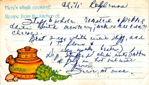 Dip stuffed chilies into batter and fry in hot oil until brown. Serve at once.