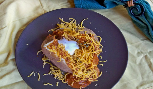 Baked potatoes stuffed with chili and cheese, nice and quick for a cool evening.
