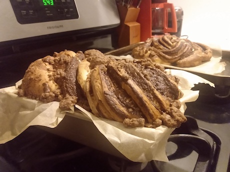 Slice one of the dough coils in half lengthwise to expose the filling. Twist the halves together as if you were braiding them, then fold the braid in half so it’s about 9 inches long. Place into a prepared pan, letting it curl around itself if it’s a little too long for the pan. Cover loosely with a clean kitchen towel and let rise in a warm place for 1 to 1 1/2 hours, until puffy (it won’t quite double). Alternatively, you can cover the pans with plastic wrap and let them rise in the refrigerator overnight; bring them back to room temperature for an hour before baking.