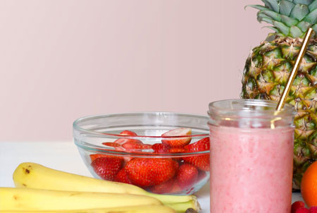 Pineapple and strawberries with banana and vanilla yogurt make a creamy delicious smoothie.