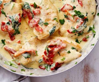 Skillet chicken prepared with a creamy sauce, spinach and sun-dried tomatoes; serve over pasta or rice.