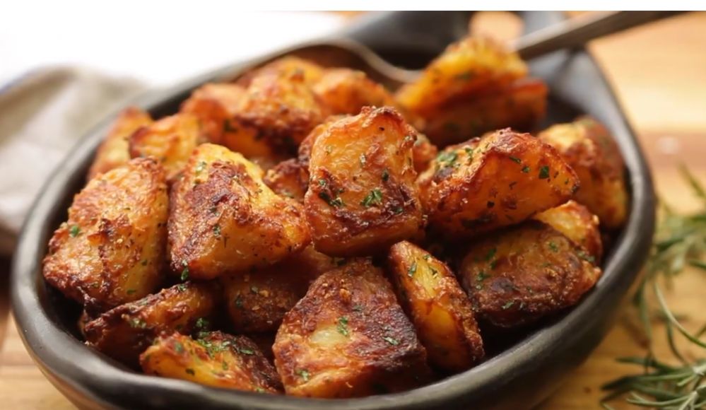 Pour half of the infused oil (reserve the garlic and rosemary to garnish at the end) over the potatoes (you might need to add some more, potatoes need a lot of oil to get nice and crispy) arrange the halved garlic bulb in the pan, sprinkle with more salt and some black pepper along with a bit more fresh rosemary, then roast for about 35 to 45 minutes or until golden brown and crispy
