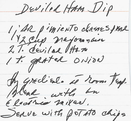 Pimiento cheese, deviled ham and onion make a creamy dip for serving with potato chips.