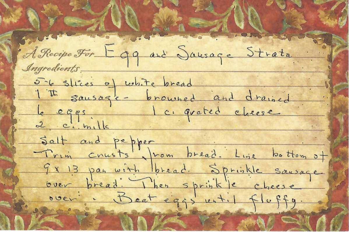 Trim crusts from bread. Line bottom of 9x13 pan with bread. Sprinkle sausage over bread. Then sprinkle cheese over it.
