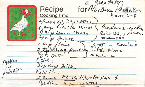 Combine egg yolks with ricotta, sour cream, and sugar. Sift together the flour, baking powder and salt. Combine dry ingredients with wet ingredients. Add milk. In a separate bowl, beat egg whites until fluffy. Fold blueberries and egg whites into batter.