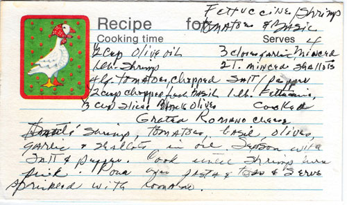 Pasta tossed with shrimp, tomatoes, olives, garlic and basil.