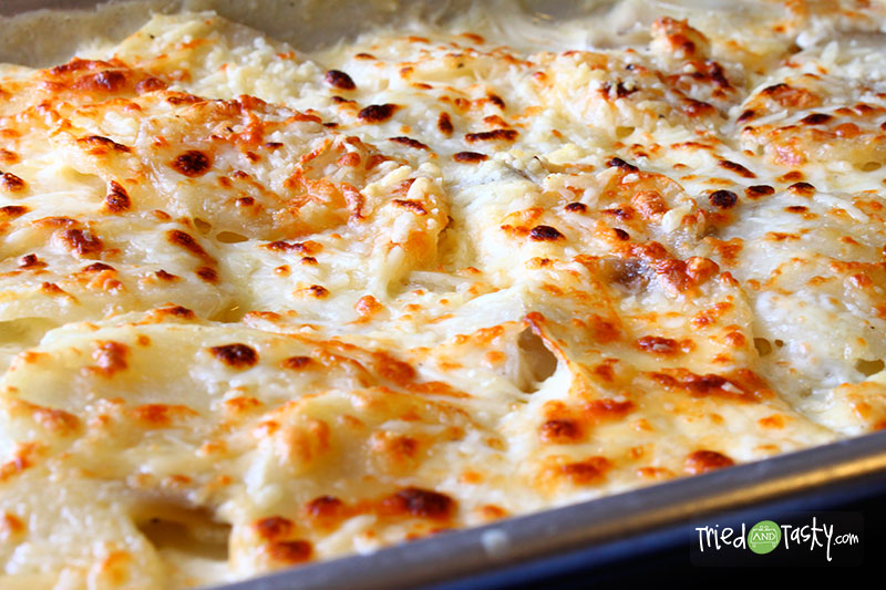 Heat the skillet over medium-high heat. Add half of the potatoes, spreading them out. Sprinkle with 3/4 tsp. salt, half of the cut up butter, half of the shredded cheese blend, and pepper to taste. Pour the cream over the potatoes, then add the nutmeg and bay leaves; simmer three minutes.