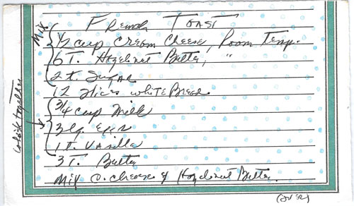 French toast slices spread with hazelnut butter and cream cheese topped with maple syrup or honey.