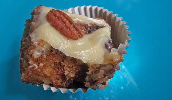 Soften cream cheese and butter. Mix with sugar, vanilla, and pinch of salt until smooth. Spread on hot cake in pan. Sprinkle chopped pecans on top.