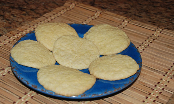 Roll dough into 2-inch balls and roll in sugar (place sugar in a small bowl, drop dough ball into sugar and roll briefly). Place dough ball on greased baking sheet and slightly flatten.