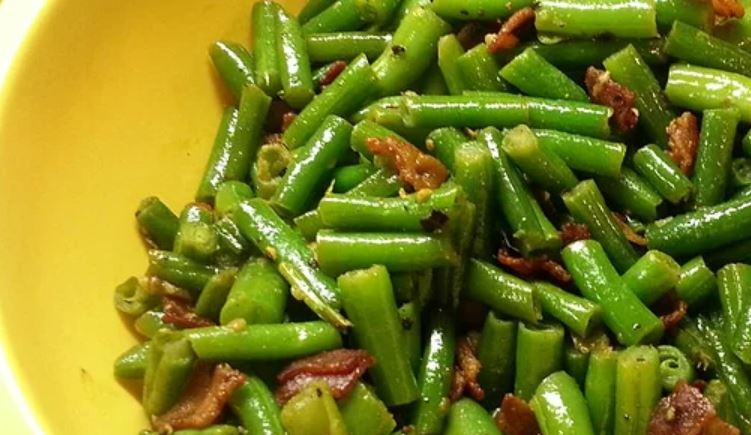Green beans sauteed with bacon, garlic, salt and red pepper.
