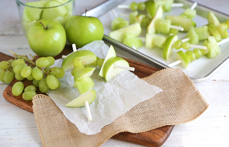 1 Tbsp. lemon juice 1 Large Granny Smith Apple cored and chopped 1 cup Green seedless grapes 2 cups honeydew melon, chopped 2 large Green pears cored and chopped 12 wooden skewers