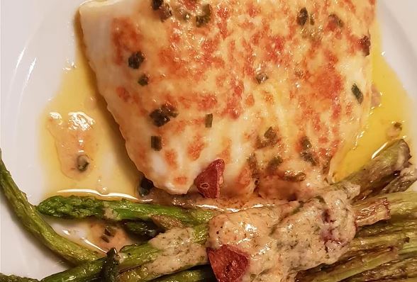 Rich cheesy topping with mild flavored oven-roasted halibut.