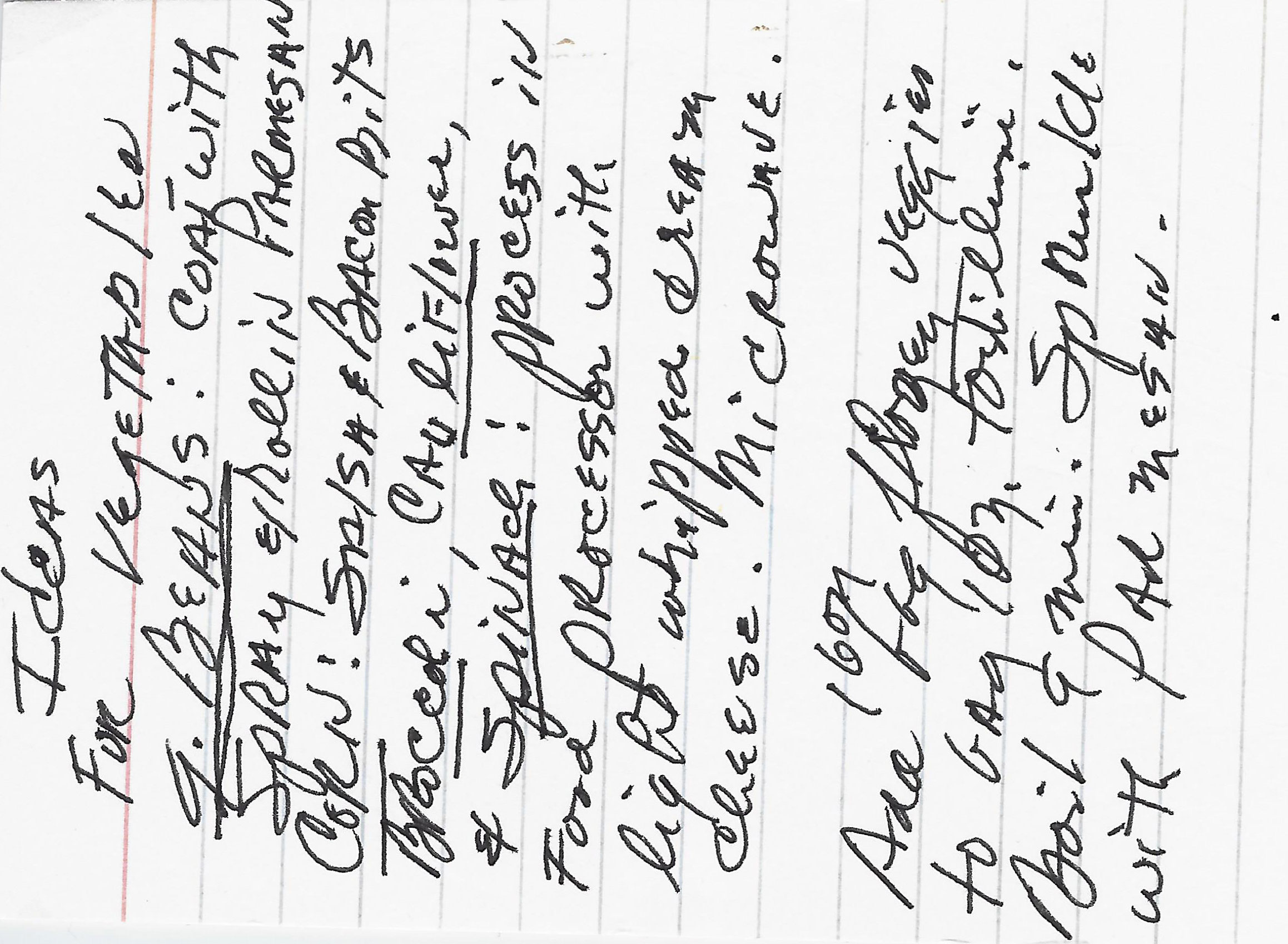 Broccoli, Cauliflower and Spinach: Process in food processor with light whipped cream cheese. Microwave.