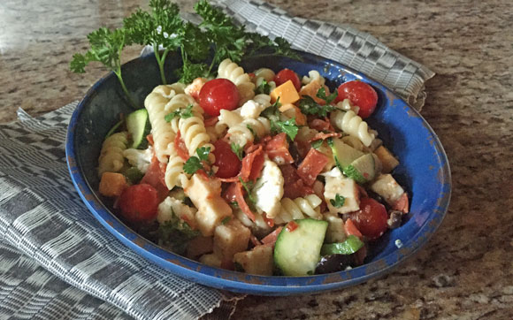 Pasta tossed with zucchini, cauliflower, olives, tomatoes, pepperoni, cheese, and Italian dressing; let chill a few hours before serving. Delish!