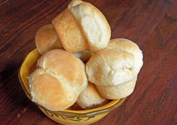 Butter a 12 cup muffin tin. Punch down dough. Pinch off pieces about 1 1/2 inches in diameter ( enough to fill 1/2 of muffin cup), and roll into smooth spheres. Place two such pieces in each prepared muffin cup. ( It should be a tight fit). Cover dough loosely with a towel and let rise for 45 minutes.
