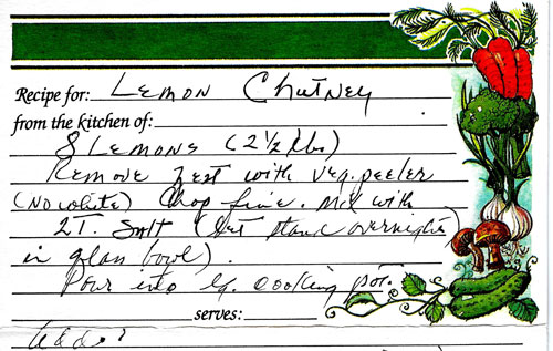 Remove zest from lemons with vegetable peeler (no whites). Chop finely. Mix with salt and let stand overnight in glass bowl.