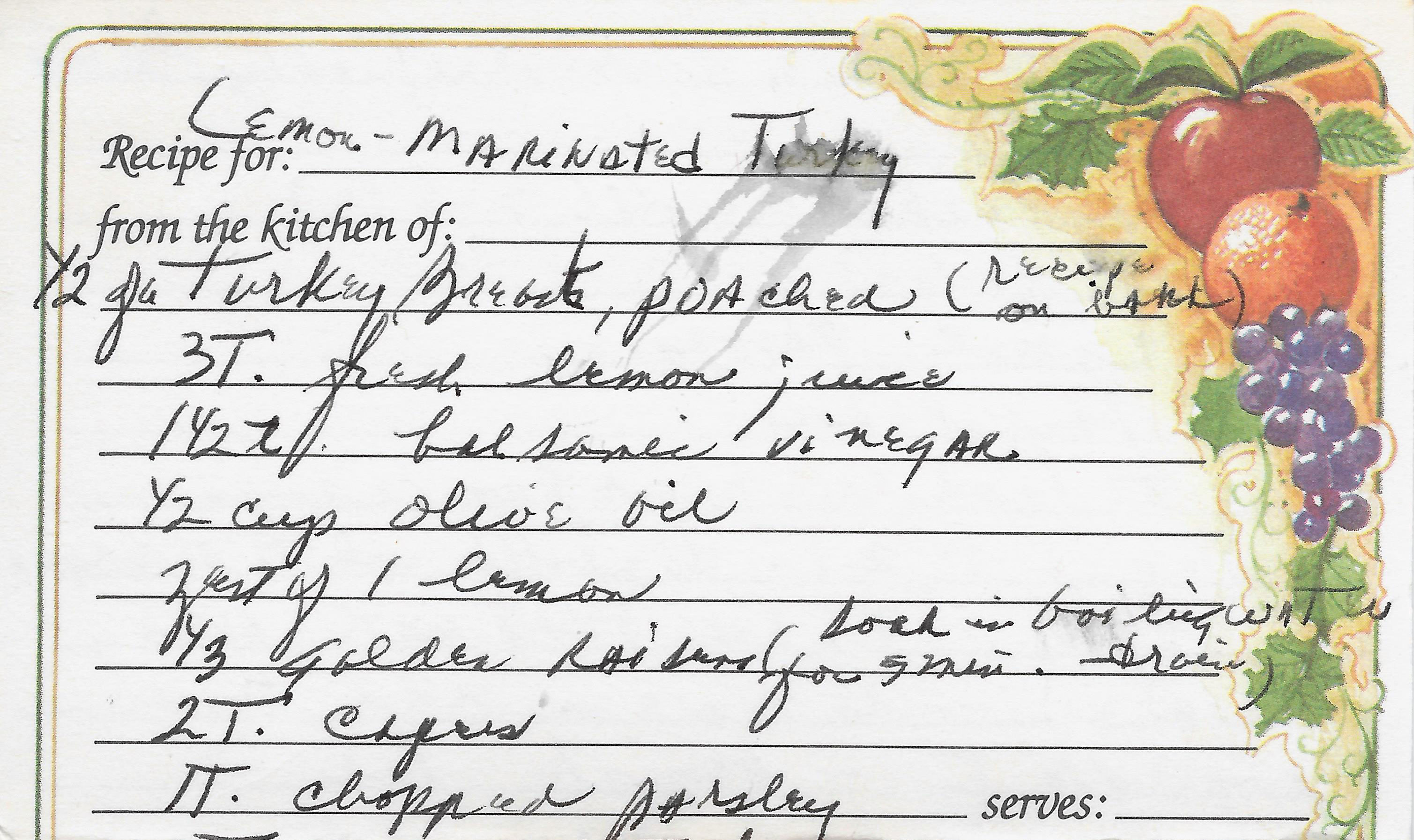 Poached turkey breast marinated overnight in balsamic and lemon sauce; served cold with mint leaves and pine nuts.