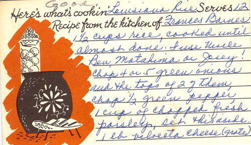 Baked rice dish with green onions, green pepper, Velveeta, and seasonings.