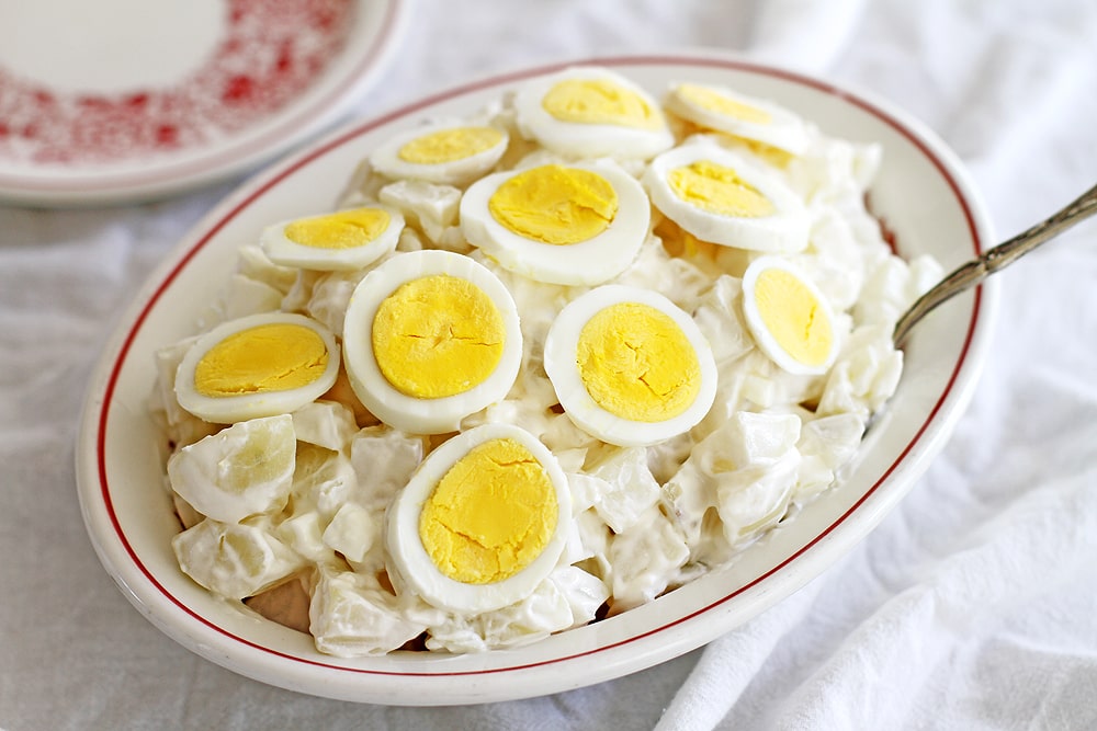3. Drain potatoes. When they have stopped steaming, refrigerate until chilled (about 30 min.). Dice cooled potatoes into bite-sized cubes. Fold in hard-cooked eggs.