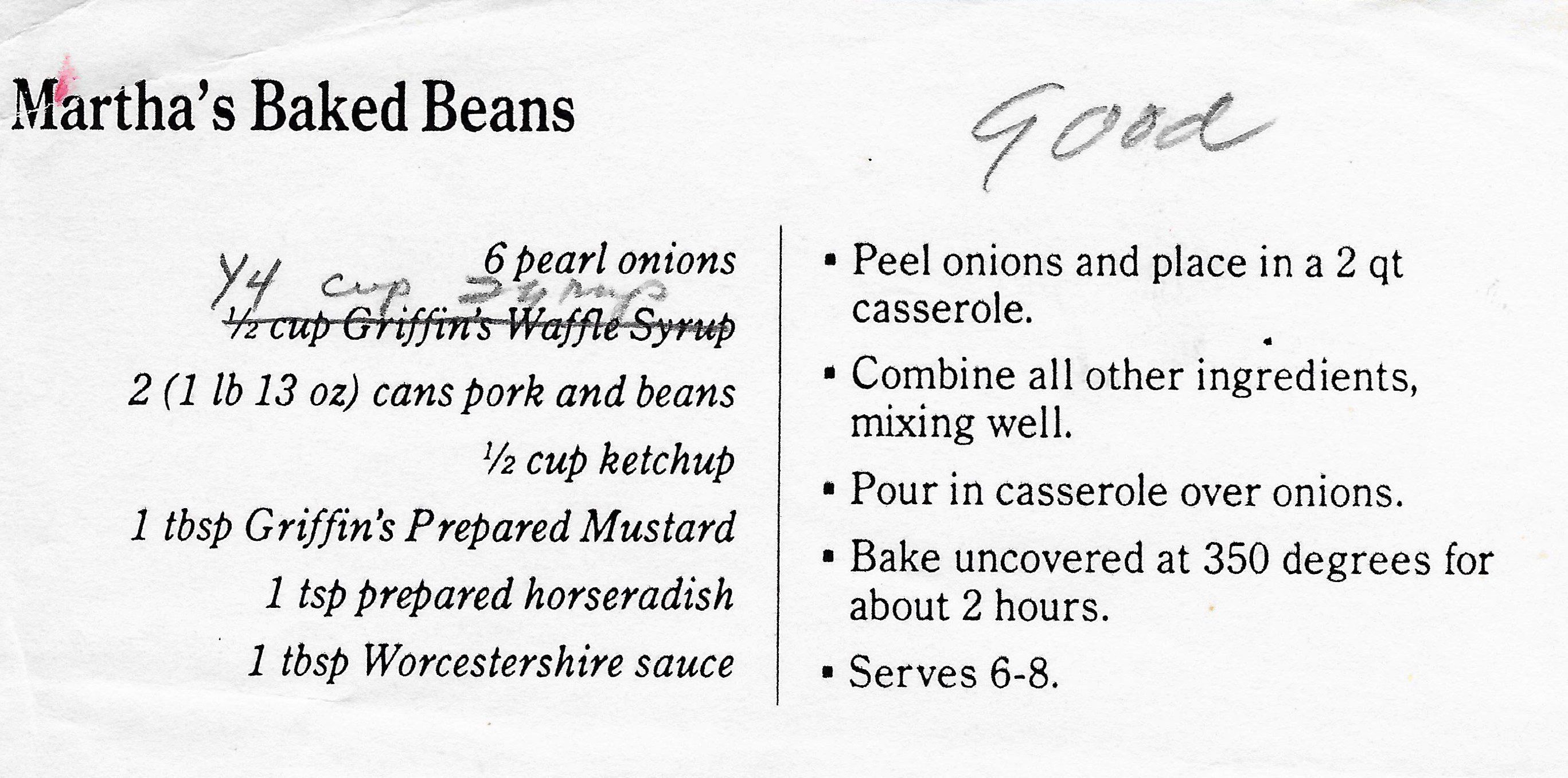 Pork and beans baked with pearl onions, syrup, and seasonings.
